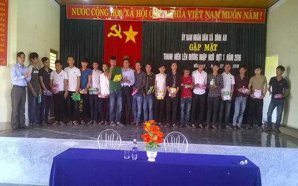 Trong đợt tuyển chọn và gọi công dân lên đường nhập ngũ lần này xã Bình An có 20 thanh niên lên đường nhập ngũ, trong đó 100% là đoàn viên. Tại buổi gặp mặt, đồng chí Lê Hồng Thiết - Phó Bí thư Đảng uỷ, Chủ tịch UBND xã đã gửi lời thăm hỏi, động viên thanh niên giữ gìn sức khỏe, phấn đấu hoàn thành tốt nhiệm vụ, xứng danh anh bộ đội Cụ Hồ, góp phần vào công cuộc xây dựng và bảo vệ Tổ quốc Việt Nam xã hội chủ nghĩa..