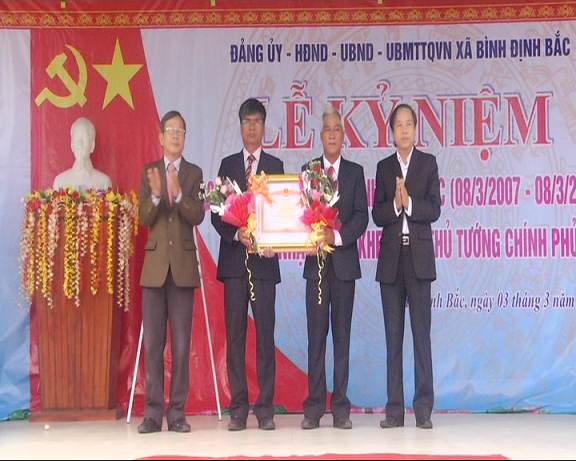 Với những thành tích đạt được trong chặng đường 10 năm qua, Đảng bộ và nhân dân xã Bình Định Bắc đã được Đảng, Nhà nước ghi nhận và tặng nhiều phần thưởng cao quý. Dịp này, cán bộ và nhân dân xã vinh dự đón nhận Bằng khen của Thủ tướng Chính phủ./.