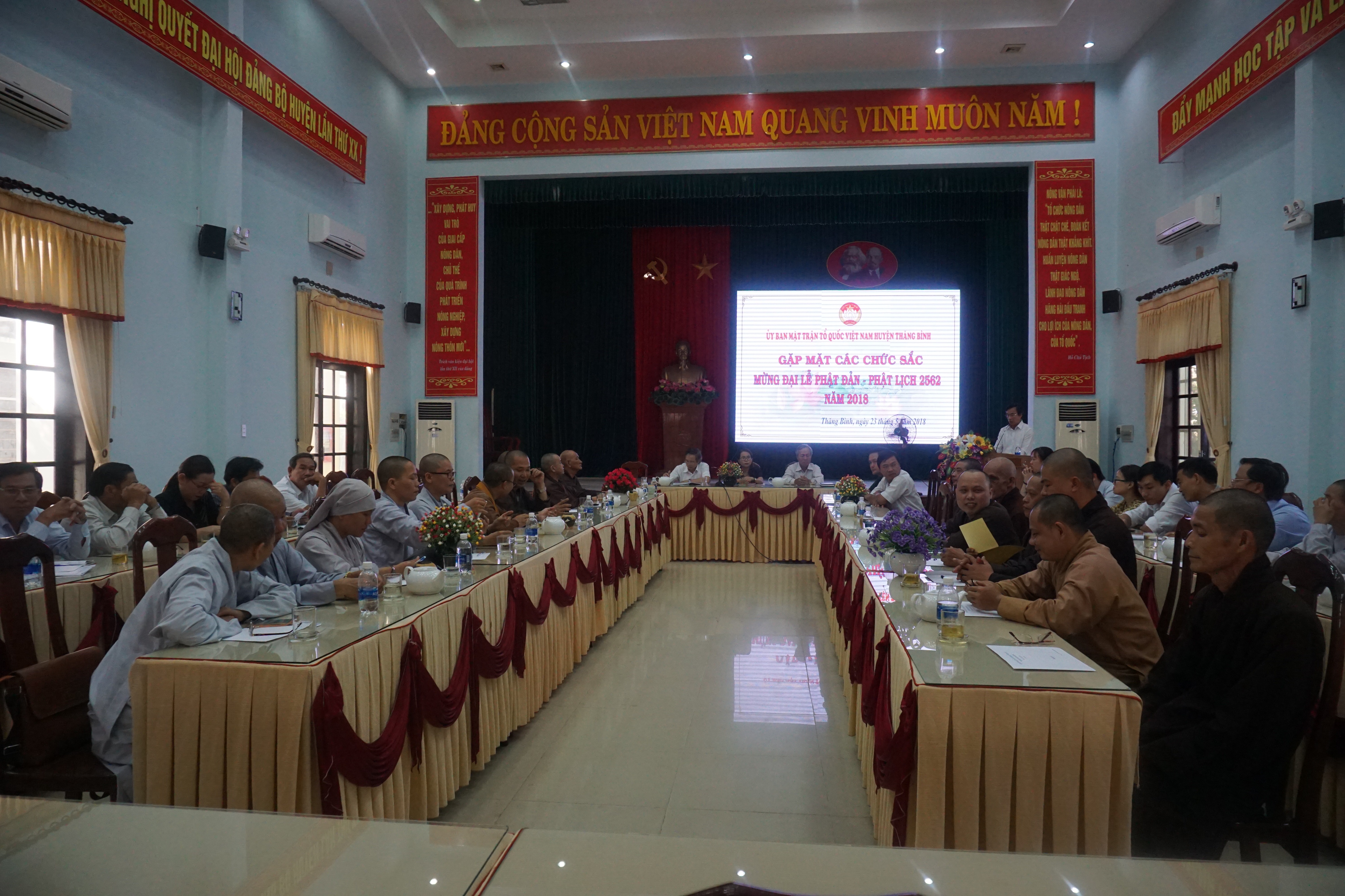 Phát biểu tại buổi gặp mặt ông Hồ Văn Minh – Chủ tịch UBMTTQVN huyện cho biết: Đảng ta luôn xác định trong suốt chiều dài lịch sử, Phật giáo luôn gắn bó, đồng hành cùng dân tộc, luôn phấn đấu vì mục tiêu độc lập dân tộc, tự do, hạnh phúc, an vui cho con người. Đối với giáo hội Phật giáo Việt Nam huyện Thăng Bình, trong thời gian qua, với vai trò là thành viên của MTTQVN huyện, Quý Chư tôn đức giáo phẩm, Tăng Ni đã tích cực vận động đồng bào Phật tử thực hiện tốt chủ trương, đường lối của Đảng và Nhà nước, sống đoàn kết, hòa hợp giữa Đạo và Đời, giữa các tôn giáo, tích cực tham gia các hoạt động nhân đạo từ thiện, các phong trào thi đua do Ủy Ban MTTQVN phát động như: cuộc vận động toàn dân đoàn kết xây dựng đời sống văn hóa ở khu dân cư, người Việt Nam ưu tiên dùng hàng Việt Nam. Đặc biệt trong năm 2017, Giáo hội Phật giáo Việt Nam huyện Thăng Bình đã ký kết chương trình tham gia bảo vệ môi trường với biến đổi khí hậu cùng Ủy ban MTTQ Việt Nam huyện và Phòng Tài nguyên- Môi trường. Cạnh đó, Ban Trị sự giáo Hội Phật giáo Việt Nam huyện Thăng Bình cùng chung tay góp sức với lãnh đạo huyện trong những sự kiện quan trọng, tham gia ủng hộ vào nguồn quỹ chung tay Vì Người nghèo. Chính những đóng góp quan trọng đó đã góp phần đưa kinh tế, xã hội, quốc phòng, an ninh, công tác xây dựng hệ thống chính trị có nhiều chuyển biến tích cực. Kinh tế tiếp tục tăng trưởng khá, các chỉ tiêu thực hiện trong năm 2017 và 5 tháng đầu năm 2018 cơ bản hoàn thành. Đặc biệt thu ngân sách năm 2017 vượt dự toán, kinh tế nông nghiệp, công nghiệp, xây dựng, thương mại dịch vụ, thu hút đầu tư… được tập trung chỉ đạo và đã đạt những kết quả nhất định. Văn hóa xã hội có nhiều khởi sắc, chính sách an sinh xã hội được quan tâm đúng mức, đời sống của nhân dân trong huyện từng bước được nâng lên, đến nay tỷ lệ hộ nghèo toàn huyện giảm còn 6,24%. Bộ mặt nông thôn tiếp tục được đổi mới, đến nay đã có 10 xã đạt chuẩn nông thôn mới, năm 2018 phấn đấu có thêm 3 xã là Bình Nguyên, Bình Đào và Bình Triều đạt chuẩn xã NTM…