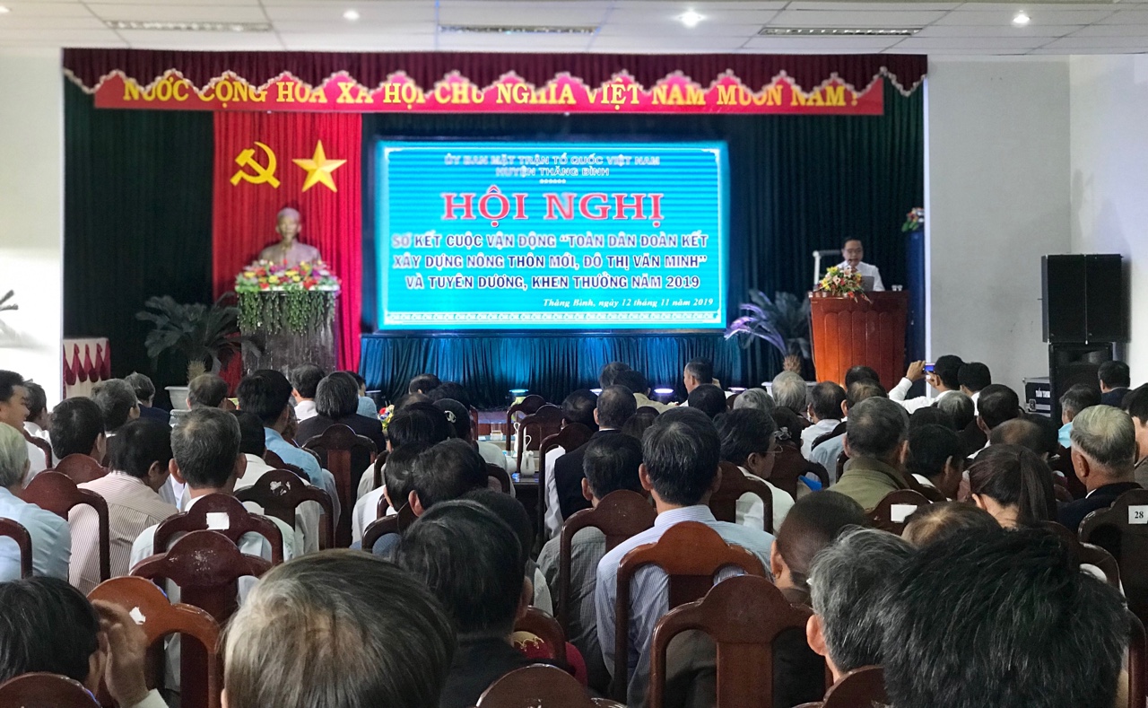 Kế thừa, tích hợp những kết quả quan trọng của hai cuộc vận động “Toàn dân đoàn kết xây dựng đời sống văn hóa” ở khu dân cư và cuộc vận động“Ngày vì người nghèo”; Cuộc vận động “Toàn dân đoàn kết xây dựng nông thôn mới, đô thị văn minh” được phát động. Qua 04 năm triển khai thực hiện, cuộc vận động đã đạt nhiều thành tựu quan trọng và đem lại hiệu quả thiết thực, có ý nghĩa chính trị, xã hội, nhân văn sâu sắc, ngày càng lan tỏa sâu rộng, phát huy mạnh mẽ truyền thống đoàn kết, khơi dậy lòng yêu nước, sức mạnh nội lực của toàn dân, mỗi gia đình, mỗi cộng đồng dân cư, tộc họ tích cực tham gia thực hiện thắng lợi các nhiệm vụ kinh tế xã hội ở địa phương; đời sống vật chất, tinh thần của người dân ngày càng được cải thiện, hộ nghèo giảm nhanh, đến nay toàn huyện giảm còn còn 4,78%, hộ cận nghèo còn 3,36%; theo thống kê năm 2019 có 91/106 dân cư đạt chuẩn văn hóa đạt gần 86% khu, 189/263 tộc họ đạt danh hiệu đạt gần 72%; có 43.616/50.686 số hộ gia đình đạt chuẩn và giữ vững danh hiệu gia đình văn hóađạt gần 87%, có 12 xã về đích nông thôn mới, xã Bình Nguyên cũng đang tiến hành hoàn thành các thủ tục để công nhận là xã nông thôn mới vào cuối năm.
