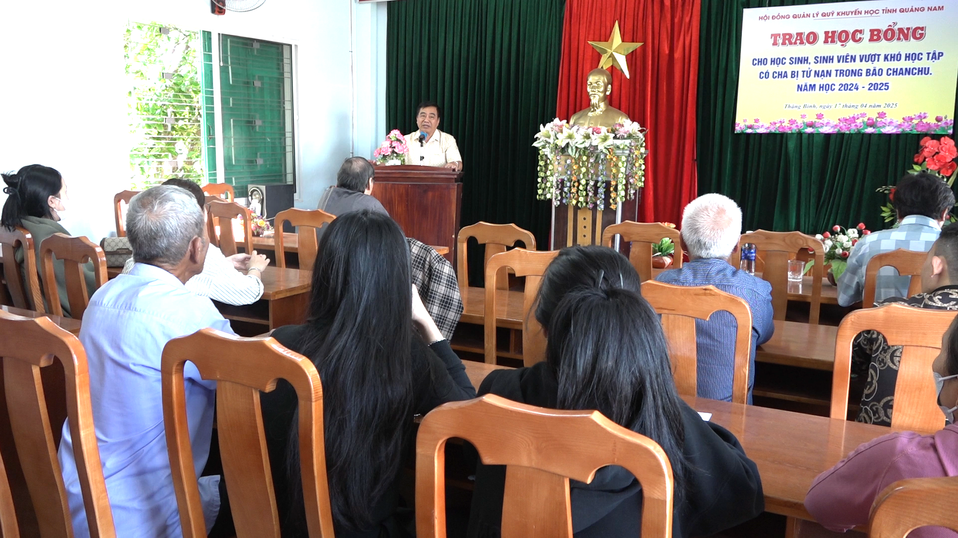Ông Nguyễn Văn Long - Phó chủ tịch Hội Khuyến học tỉnh Quảng Nam phát biểu tại chương trình trao học bổng Chanchu năm học 2024 - 2025.