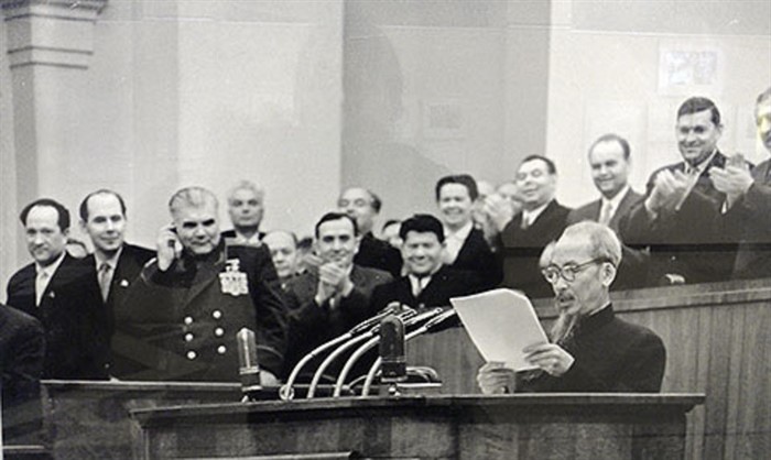(Ảnh: Chủ tịch Nước Việt Nam Dân chủ Cộng hòa Hồ Chí Minh phát biểu tại Đại hội lần thứ XXI Đảng Cộng sản Liên Xô ngày 29.1.1959)