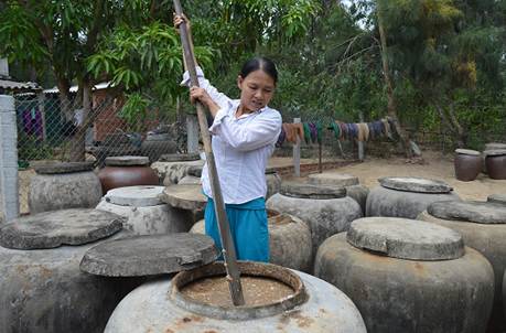Không biết gia đình mình bắt đầu làm mắm từ khi nào, chị Nguyễn Thị Huệ (thôn Hà Bình, xã Bình Minh) chỉ nhớ phụ cha mẹ làm mắm từ khi còn là một cô bé 12 tuổi. Đến nay, đã 37 năm, chị Huệ vẫn gắn chặt với nghề của gia đình. Và cũng như nhiều gia đình nơi làng biển Bình Minh, nghề làm mắm là nguồn thu nhập chính của gia đình chị. Nhưng năm nay gia đình chị Huệ chỉ sử dụng khoảng 25/50 lu để muối mắm. Chị Huệ chia sẻ: “Nguồn cá cơm để ủ mắm ngày càng ít lại mà giá lại cao nên phải chấp nhận giảm quy mô sản xuất xuống. Đồng thời, giờ làm nhiều cũng không đủ vốn vì thời gian thu hồi vốn của nghề làm nước mắm là khá lâu, đến khoảng 6 tháng. Do không quay vòng vốn kịp nên khó phát triển lắm”.