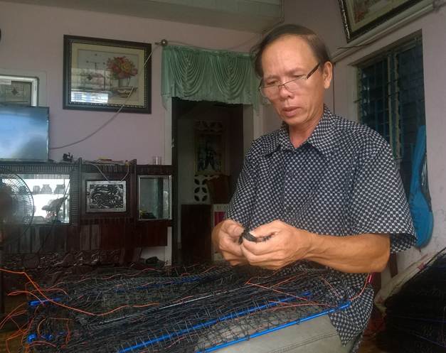 Đan giỏ lưới không đơn thuần là công việc mà còn là niềm đam mê với ông Nguyên. Ảnh: Sương Biên