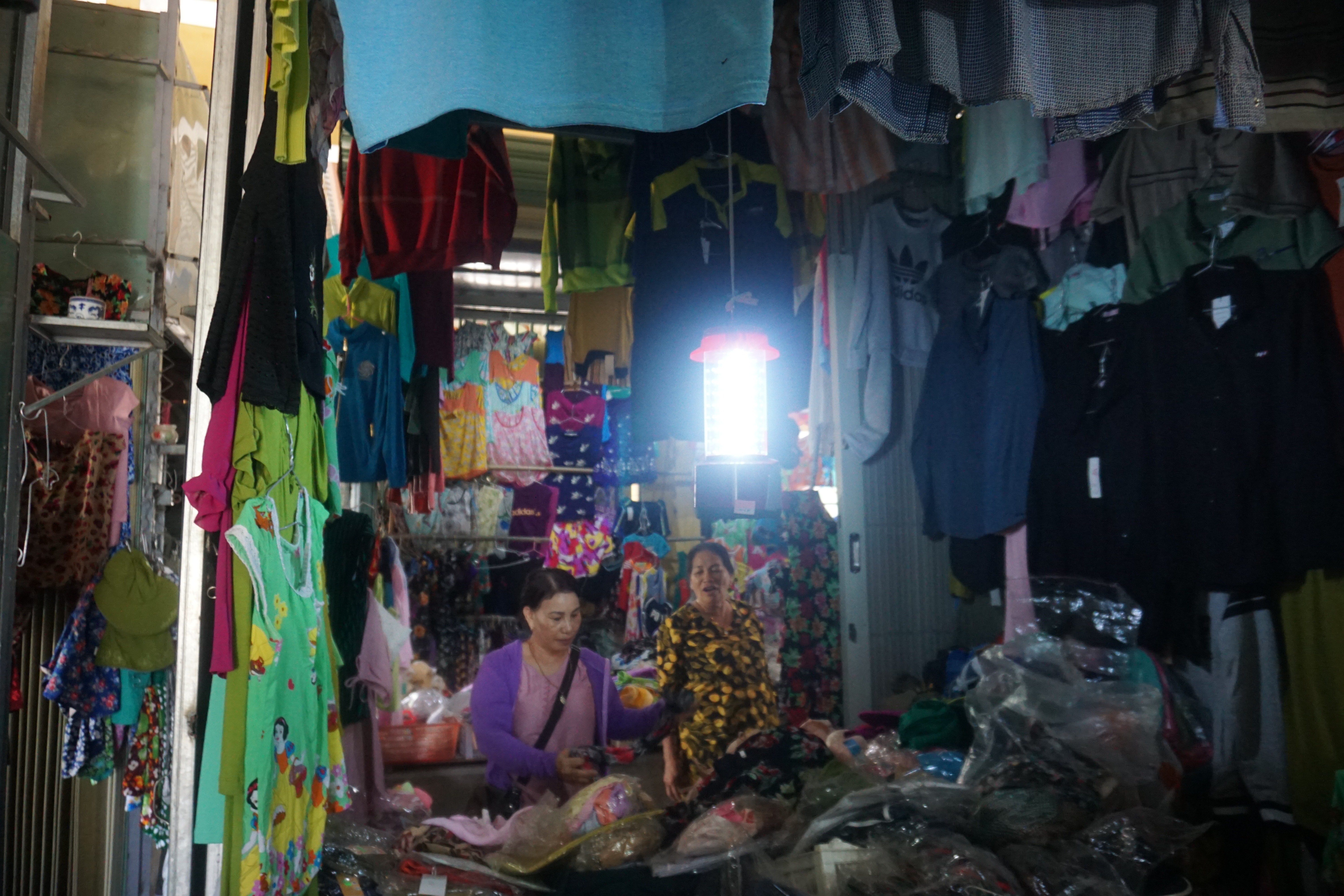 Gian hàng của bà Đặng Thị Cẩm phải dùng đèn pin để có ánh sáng bán hàng