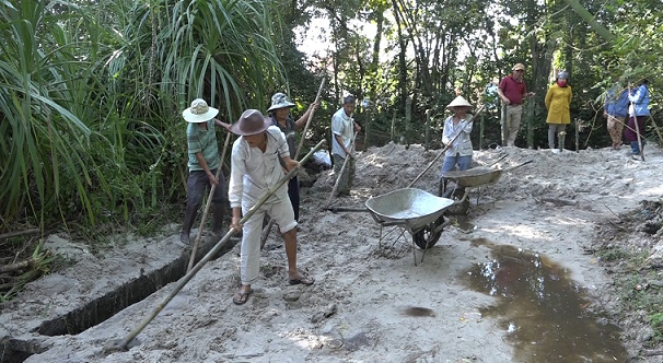 Tuyến kênh bê tông duy nhất dài gần 2km để dẫn nước tưới cho cả cánh đồng rộng 20ha tại tổ và 3 thôn Bình Trúc 1 đã bị đất cát vùi lấp khá dày hơn 500m do mưa lớn vào giữa đầu tháng 12 vừa qua. Để khắc phục, ổn định sản xuất, thôn Bình Trúc đã huy động người dân có diện tích sản xuất nằm trong khu vực ra quân nạo vét, đào đất, đắp mương để khơi thông dòng kênh. Ông Phan Văn Trung, người dân thôn Bình Trúc cho hay, tuyến kênh rất quan trọng bởi nguồn nước được dẫn từ ao thu gom nước nhỉ vào ruộng. Ruộng của bà con sản xuất được cả 2 vụ cũng nhờ vào chính con kênh dẫn nước này. Tuy nhiên do mưa lớn, đất cát đã vùi lấp, ngăn cản dòng nước phục vụ sản xuất. Vì vậy, nông dân trong thôn phải khơi thông để kịp có nước gieo sạ.