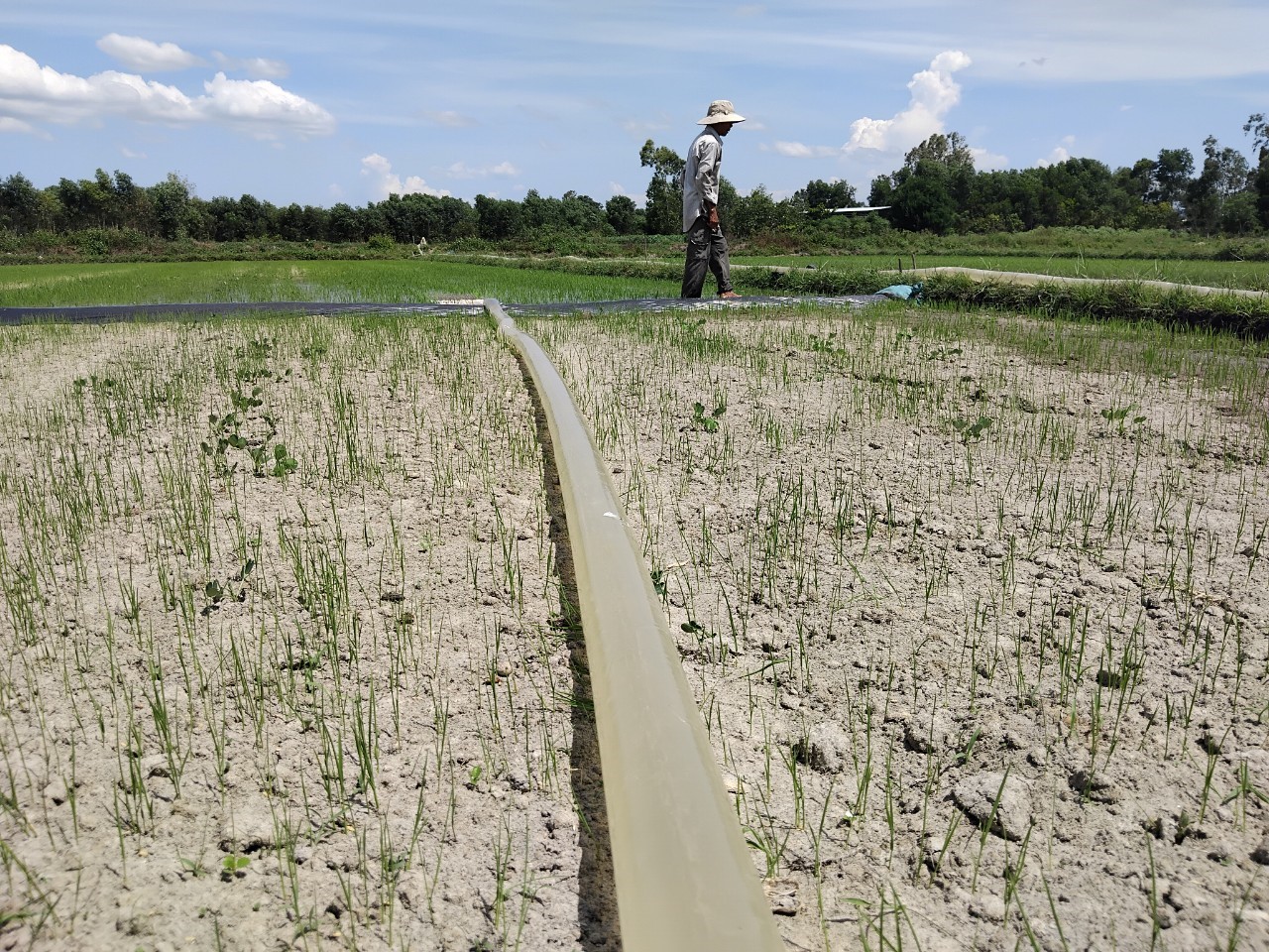 Ông Hùng cho hay lúa còn nhỏ nên phải có nước để bón phân, dặm lúa. Mà nắng nóng khô kiểu ni chắc phải bơm nước miết.