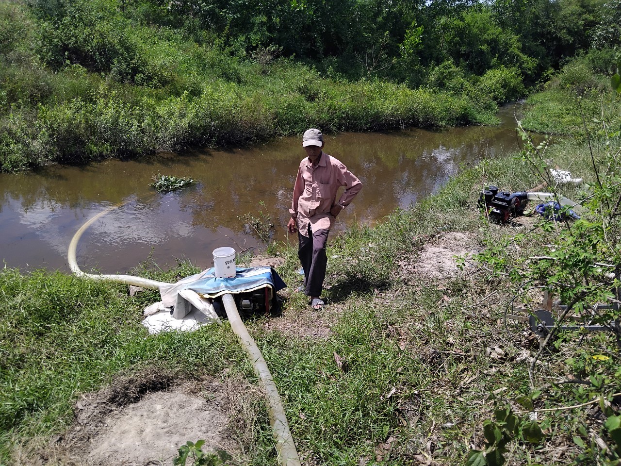 Máy bơm được lắp dưới suối để bơm nước lên ruộng