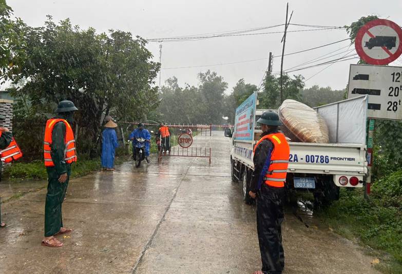 (Lực lượng công an, dân quân chốt chặn tại một số tuyến đường bị ngập ngăn không cho người dân qua lại nguy hiểm)