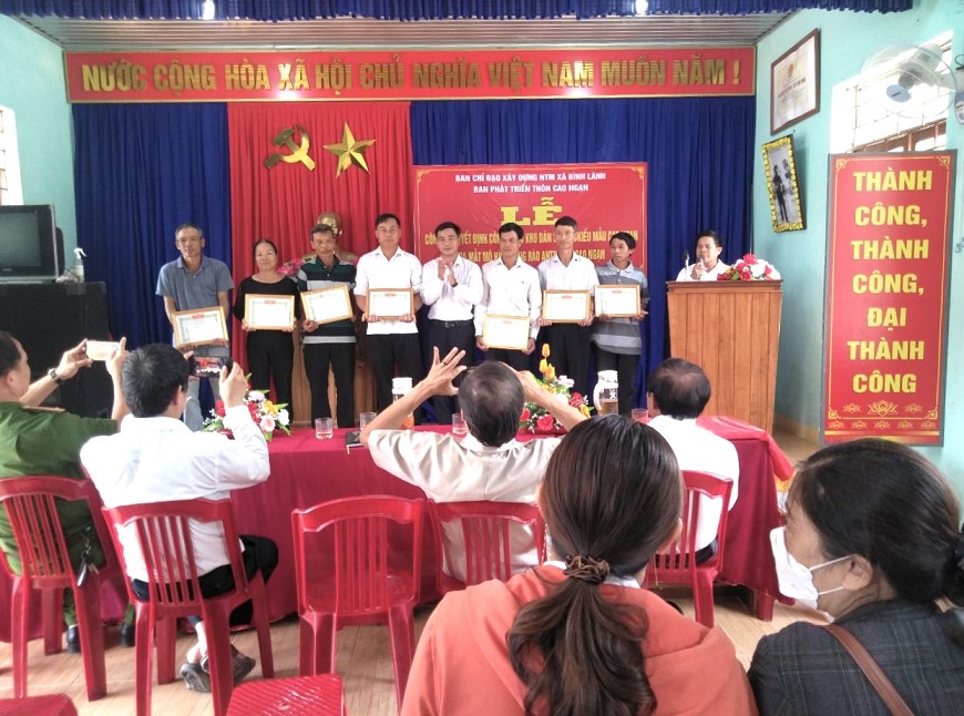 Lãnh đạo xã tặng giấy khen cho các cá nhân tại lễ công bố quyết định đạt chuẩn thôn nông thôn mới kiểu mẫu Cao Ngạn