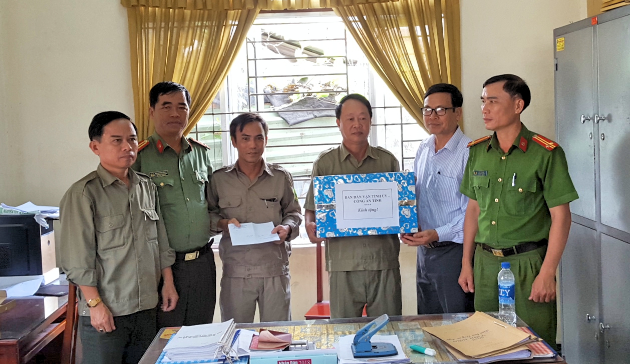Đại diện Ban dân vận Tỉnh ủy và công an tỉnh tặng quà cho ban bảo vệ dân phố thị trấn Hà Lam nhân dịp ngày hội Toàn dân bảo vệ an ninh Tổ quốc năm nay.