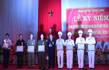 Ảnh: Đ/c Trần Thế Vinh (Thứ 4 từ trái sang) đại diện cho tập thể Công an xã Bình Đào được UBND huyện tặng giấy khen trong phong trào bảo vệ an ninh Tổ quốc (giai đoạn 2005-2015)