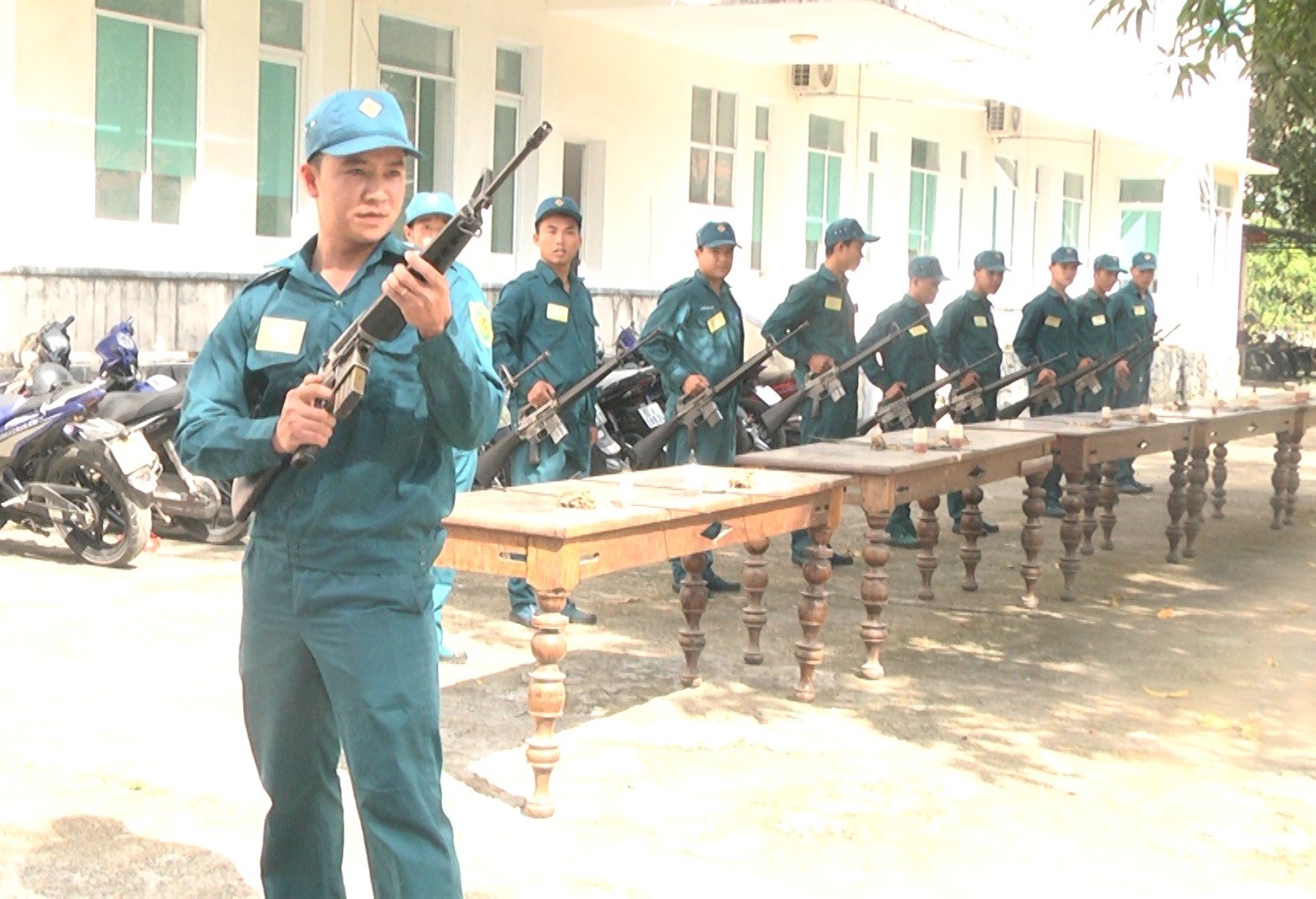 Các chiến sỹ tiểu đội dân quân thường trực tham gia thi bảo quản vũ khí trang bị tuần.