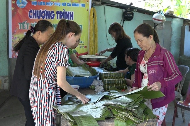 26 tết, đó là khoảng thời gian mà nhà nhà, người người đều bận bịu cho việc sửa sang nhà cửa để chuẩn bị đón tết, nhất là đối với phụ nữ, công việc lại càng nhiều. Thế nhưng nhiều năm nay, cứ vào ngày này, các chi hội trưởng phụ nữ của các thôn ở Bình Trị lại tập trung tại nhà của chị Trần Thị Tùng (thôn Châu Lâm) để gói bánh tét tặng phụ nữ nghèo. Năm nay, ngoài những đòn bánh tét, Hội LHPN xã Bình Trị còn làm thêm bánh thuẫn, bánh chưng để tặng cho phụ nữ nghèo. Các chị phân chia công việc khá rõ ràng và cùng nhau phụ trách cụ thể. Khi những đòn bánh tét được gói xong, các chị khác lại thực hiện công đoạn nấu bánh. Hơn 100 đòn bánh chưng, 50 kg bánh thuẫn đã hoàn thiện sau hơn 1 ngày làm vất vả nhưng tràn đầy niềm vui của chị em phụ nữ xã Bình Trị. Bà Nguyễn Thị Kiều - Chủ tịch Hội LHPN xã Bình Trị cho biết, ngoài 45 suất quà, mỗi suất trị giá 400.000 đồng đã trao cho các chị em phụ nữ nghèo trước đó, Hội LHPN xã còn tổ chức gói bánh tét để trao cho phụ nữ nghèo. Chương trình gói bánh tét đã duy trì nhiều năm nay không chỉ gìn giữ nét đẹp truyền thống của người Việt mỗi khi tết đến xuân về, mà ở đó còn thắt chặt tình đoàn kết, mối tương trợ giữa người với người, nhất là phụ nữ với phụ nữ cùng nhau để ai cũng có tết đầm ấm, yên vui.