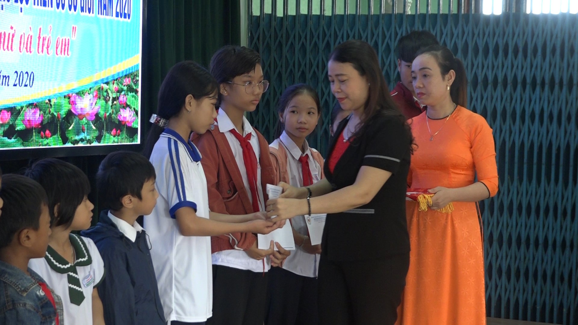 (Ảnh: Ông Nguyễn Xuân Vũ- Phó Chủ tịch UBND huyện trao quà cho các em tại Lễ phát động)
