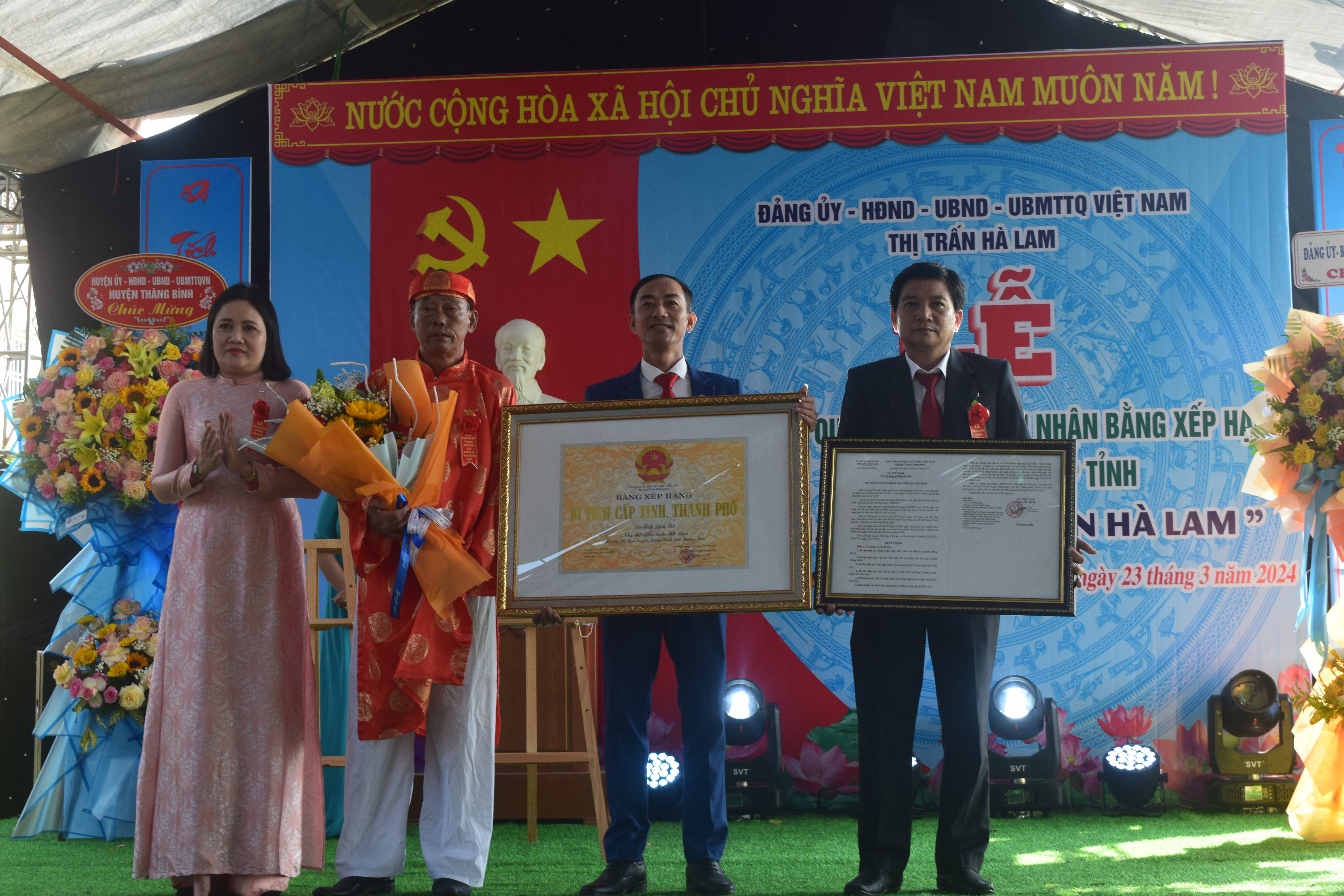 Bà Phan Thị Nhi-Phó Chủ tịch UBND huyện trao Bằng xếp hạng di tích lịch sử cấp tỉnh Nhà thờ Tiền hiền làng Hà Lam