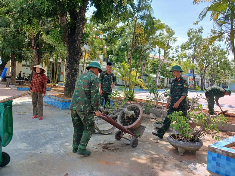Các anh đến để chung tay cùng thầy cô, biến từng góc nhỏ của ngôi trường thành một bức tranh xanh tươi, chuẩn bị đón chào năm học mới ngập tràn hy vọng. Sân trường rộng, bê tông nhiều, cây cối chưa được cắt tỉa sau gần 3 tháng nghỉ hè, cộng với cái nắng oi ả, nhưng họ đã tỉ mỉ dộn lại các góc sân trường, nhặc từng viên đá trên sân, chăm chút từng khóm cây, quét dọn sân trường sạch sẽ như gột rửa những bụi mờ của thời gian. Khối lượng công việc ấy tưởng chừng như không thể hoàn thành trong một ngày, vậy mà bằng tinh thần “đâu cần dân gọi, đấy có bộ đội”, cũng như lời Bác Hồ ta đã từng dạy: “Bộ đội ta trung với nước, hiếu với dân, nhiệm vụ nào cũng hoàn thành, khó khăn nào cũng vượt qua”, những người lính ấy, như ngọn gió mát lành giữa trưa hè, mang đến sức sống mới cho ngôi trường thân yêu.