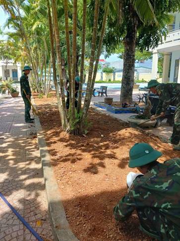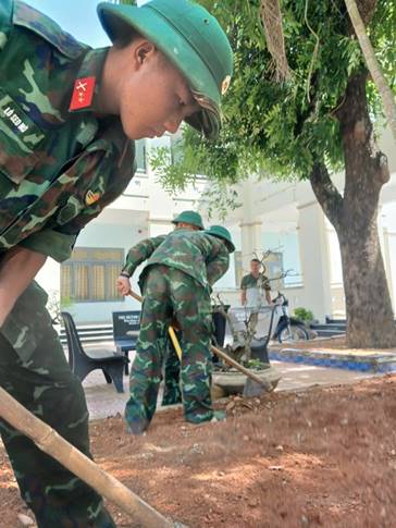 (Các chiến sĩ đang sắp xếp lại cây cảnh khuôn viên trường)