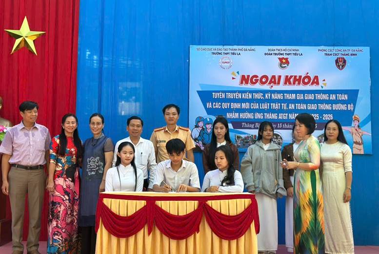 Ngoài ra, nhà trường yêu cầu học sinh và phụ huynh ký cam kết chấp hành Luật Trật tự, an toàn giao thông đường bộ, trong đó có nội dung không giao xe máy cho con em chưa đủ tuổi điều khiển. Trường hợp học sinh vi phạm, bị lực lượng công an xử phạt, nhà trường sẽ xử lý nghiêm để làm gương trong toàn trường. Em Trần Khánh Linh, học sinh lớp 11A1, Trường THPT Tiểu La, xã Thăng Bình chia sẻ: "Em tham gia buổi tuyên truyền về Luật Giao thông, em thấy rất vui và thú vị, em hiểu được các quy định về tín hiệu giao thông đường bộ, biển báo hiệu giao thông đường bộ, những làn xe nào được đi và không được đi, hiệu lệnh của tín hiệu đèn giao thông và chỉ dẫn của báo hiệu đường bộ, hiệu lệnh của Cảnh sát giao thông".
