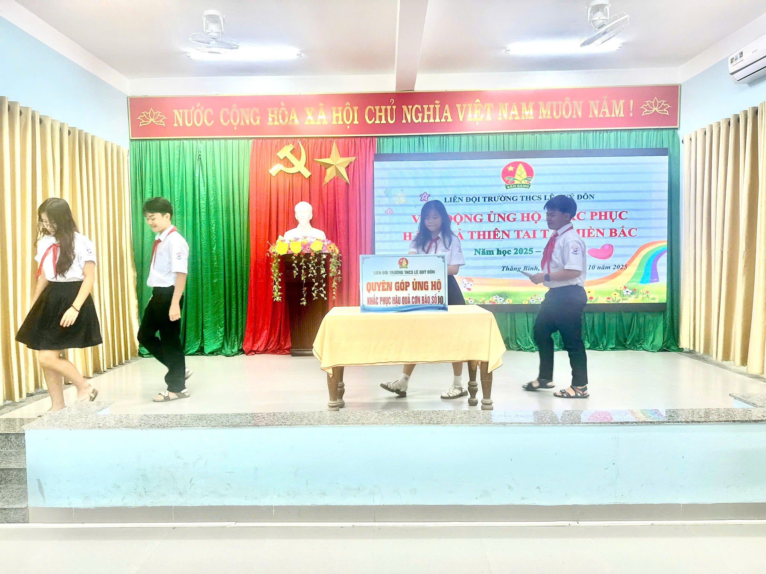 Trước những mất mát ấy, thầy và trò Trường THCS Lê Quý Đôn đã bày tỏ tinh thần tương thân tương ái, phát huy truyền thống Lá lành đùm lá rách “Thương người như thể thương thân”. Tại buổi lễ, Liên đội đã kêu gọi toàn thể cán bộ, giáo viên, nhân viên và học sinh trong toàn trường cùng chung tay quyên góp. Chỉ trong thời gian ngắn, phong trào đã nhận được sự hưởng ứng tích cực của toàn thể cán bộ, giáo viên, nhân viên và học sinh với tổng số tiền quyên góp được là 20.000.000 đồng (Hai mươi triệu đồng). Toàn bộ số tiền vận động được Liên đội sẽ chuyển về Cơ quan UBMTTQ Việt Nam xã Thăng Bình.