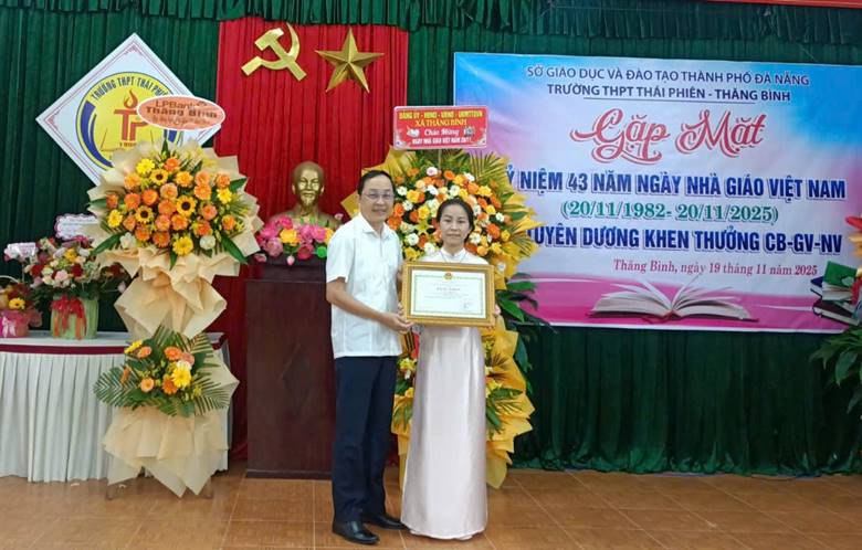 (Đồng chí Nguyễn Văn Lượm - Bí thư Đảng ủy trao Bằng khen của UBND thành phố Đà Nẵng cho 01 giáo viên)