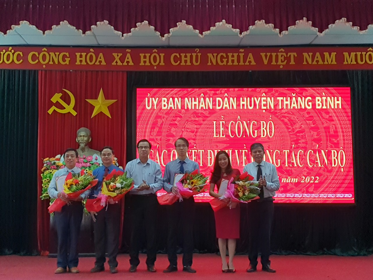 Căn cứ quy định số 247-QĐ/HU, ngày 22.3.2022 của Ban Thường vụ Huyện ủy về chuyển đổi vị trí công tác đối với cán bộ, công chức, viên chức trong hệ thống chính trị huyện và Kế hoạch số 66-KH/HU ngày 23.3.2022 của Ban Thường vụ Huyện ủy về chuyển đổi vị trí công tác đối với cán bộ lãnh đạo, quản lý các phòng, ban của huyện năm 2022; căn cứ Quy định số 19-QĐ/HU, ngày 09.9.2020 của Ban Thường vụ Huyện ủy Thăng Bình về phân cấp quản lý cán bộ và bổ nhiệm, giời thiệu cán bộ ứng cử. UBND huyện Thăng Bình đã công bố và trao các quyết điều động ông Trần Văn Vinh - Phó Chánh Văn phòng HĐND&UBND huyện đến nhận công tác tại Thanh tra huyện và bổ nhiệm có thời hạn giữ chức vụ Phó Chánh Thanh tra huyện kể từ ngày 16.5. Điều động ông Lưu Đức Phương- Phó Chánh Thanh tra huyện đến nhận công tác tại Văn phòng HĐND&UBND huyện và bổ nhiệm có thời hạn giữ chức vụ Phó Chánh Văn phòng HĐND&UBND huyện, kể từ ngày 16.5. Điều động ông Mai Văn Vinh - Phó Trưởng phòng Nội vụ huyện đến nhận cộng tác tại Huyện ủy Thăng Bình, kể từ ngày 18.5. Đồng thời tiếp nhận bà Châu Thị Thủy - Phó Trưởng Ban Tổ chức Huyện ủy, bổ nhiệm có thời hạn giữ chức vụ Phó Trưởng phòng Nội vụ huyện Thăng Bình kể từ ngày 18.5.