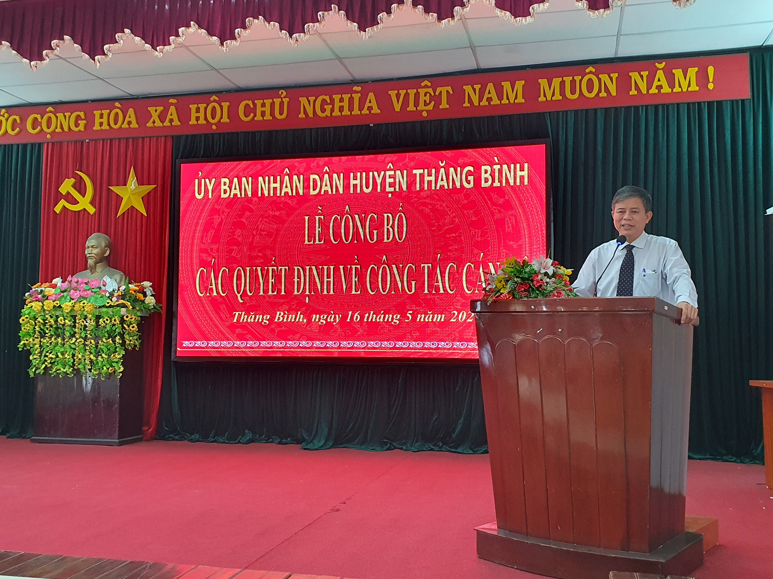 Tại lễ trao quyết định ông Võ Văn Hùng - Phó Bí thư Huyện ủy, Chủ tịch UBND huyện đã biểu dương những kết quả trong quá trình công tác của các đồng chí trong thời gian qua và chúc mừng các đồng chí được tin tưởng giao nhiệm vụ công tác mới. Phó Bí thư huyện ủy, Chủ tịch UBND huyện Thăng Bình Võ Văn Hùng động viên các cá nhân sẽ luôn nỗ lực, khắc phục khó khăn, tiếp tục học hỏi, rèn luyện, phát huy trí tuệ và những kinh nghiệm đã đúc kết từ thực tế cùng với tập thể đơn vị xây dựng khối đại đoàn kết, thống nhất, hoàn thành xuất sắc nhiệm được giao./.