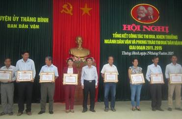 Cũng tại hội nghị, Ban Thường vụ Huyện ủy đã tặng giấy khen cho 9 tập thể và 9 cá nhân có thành tích xuất sắc trong công tác thi đua, khen thưởng ngành dân vận và phong trào thi đua “Dân vận khéo” giai đoạn 2011-2015.