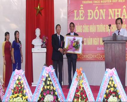 Ảnh: Ông Hồng Quốc Cường - Phó bí thư Huyện ủy, Chủ tịch UBND huyện trao bằng công nhận trường đạt chuẩn quốc gia cho trường THCS Nguyễn Duy Hiệu.