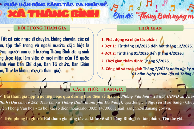 Ủy ban nhân dân xã Thăng Bình triển khai Cuộc vận động sáng tác ca khúc về xã Thăng Bình với chủ đề "Thăng Bình ngày mới". Theo đó, cuộc vận động sẽ diễn ra trong...