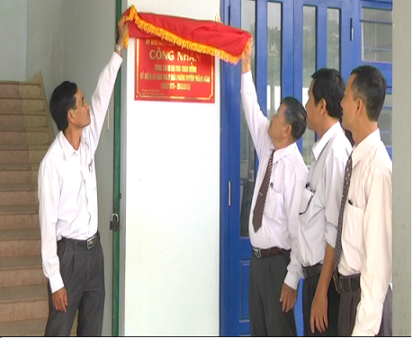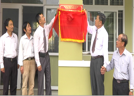 Ảnh: Đồng chí Nguyễn Văn Ngữ - Phó bí thư huyện ủy, Chủ tịch UBND huyện và đồng chí Nguyễn Đình Hồng - Bí thư đảng ủy xã Bình Tú gắn biển công trình trường TH Lê Độ