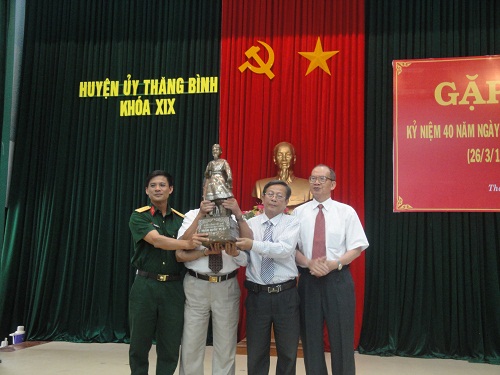 Đ/c Nguyễn Văn Tá- Chính ủy Trung đoàn 31 trao tượng Hưng Đạo Vương Trần Quốc Tuấn cho lãnh đạo huyện