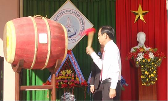 Ảnh: Phó Chủ tịch UBND tỉnh Nguyễn Chín đánh trống khai giảng tại trường THPT Hùng Vương.