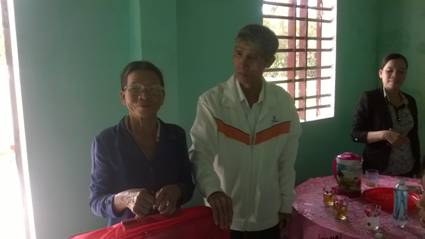 Tại buổi bàn giao ông Võ Văn Hanh – PCTUBMTTQVN huyện Thăng Bình và bà Bùi Thị Tường - Chủ tịch UBMTTQVN xã Bình Trung đã tặng quà cho gia đình bà Hiền nhân dịp bàn giao nhà mới.