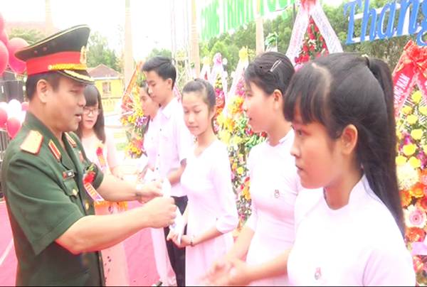 (Trung tướng Lê Chiêm- UVTWĐ, Thứ trưởng Bộ quốc phòng, tặng học bổng cho các em học sinh vượt khó học tập của trường THPT Lý Tự Trọng.)