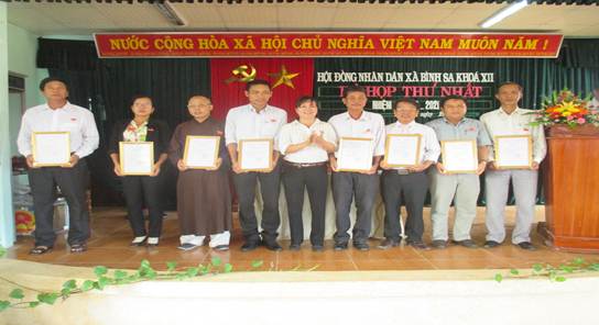 Ảnh: Đ/c Huỳnh Thị Tám trao giấy chứng nhận đại biểu cho các đại biểu HĐND xã khóa XII