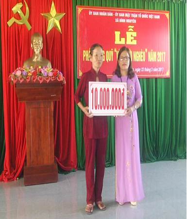 Ảnh: Bà Đinh Thị Ngân - Chủ tịch UBMTQVN xã Bình Nguyên trao tiền