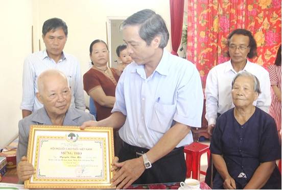 trao thiếp mừng thọ của Hội Người cao tuổi Việt Nam cho cụ ông Nguyễn Văn Mỗi (90 tuổi) ở thị trấn Hà Lam