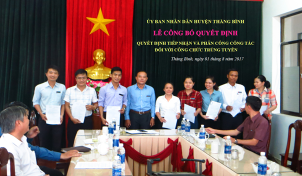 Chiều ngày 01/8/2017, UBND huyện Thăng Bình tổ chức công bố quyết định tiếp nhận và phân công công tác đối với thí sinh trúng tuyển công chức vào các cơ quan hành chính thuộc UBND huyện Thăng Bình. Tham dự buổi công bố quyết định có đồng chí Lê Quang Hạt, UVBTV, Trưởng phòng Nội vụ huyện; Thủ trưởng các cơ quan có công chức trúng tuyển và 08 thí sinh trúng tuyển công chức vào các cơ quan hành chính thuộc UBND huyện Thăng Bình.