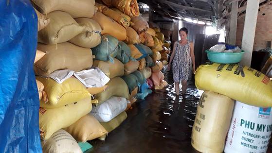 Nước lên nhanh đã khiến cho 7 tấn lúa gạo của gia đình bà Hạnh bị ngập.