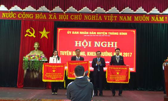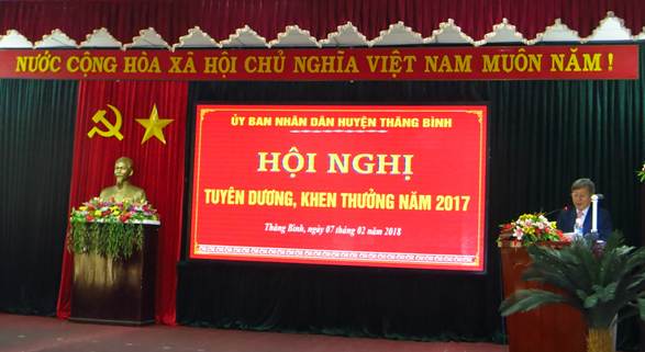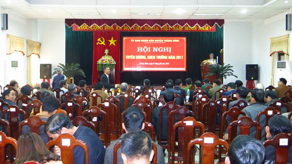 Hội nghị đã tuyên dương khen thưởng: 4 cá nhân được tặng Bằng khen Thủ tướng chính phủ; 6 tập thể, 8 cá nhân được tặng Bằng khen của Chủ tịch UBND tỉnh; 10 tập thể được tặng Cờ thi đua của UBND tỉnh; 18 tập thể được tặng danh hiệu Tập thể lao động xuất sắc; 02 cá nhân được tặng danh hiệu Chiến sĩ thi đua cấp tỉnh; 77 cá nhân được tặng danh hiệu Chiến sĩ thi đua cấp cơ sở; 42 tập thể và 130 cá nhân được Chủ tịch UBND huyện tặng giấy khen. Trong năm 2017 đã có nhiều tập thể và cá nhân có thành tích xuất sắc góp phần phát triển kinh tế xã hội đảm bảo quốc phòng an ninh như: Công an huyện được đề nghị tặng cờ của Bộ Công an; Phòng Tài nguyên và Môi trường, Thanh tra huyện, Huyện đoàn, Hội Tù yêu nước, Trung tâm Dân số KHHGĐ huyện, Phòng giao dịch Ngân hàng chính sách xã hội huyện được Chủ tịch UBND tỉnh tặng cờ dẫn đầu cụm thi đua và các đơn vị xếp thứ 2 cụm như Phòng Nội vụ, Cơ quan Quân sự huyện, Hội Từ thiện được Chủ tịch UBND tỉnh tặng Bằng khen.