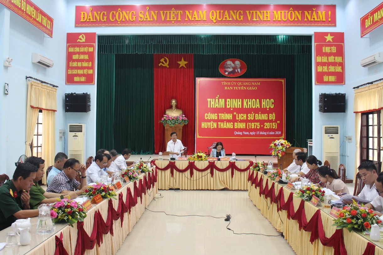 Đồng chí Phan Công Vỹ - TUV, Bí thư Huyện ủy đã báo cáo những nội dung liên quan đến chủ trương và quá trình lãnh đạo, chỉ đạo và việc triển khai nghiên cứu, biên soạn; đại biện ban biên soạn giải trình một số vấn đề liên quan đến nội dung công trình cũng như những thuận lợi, khó khăn trong quá trình triển khai thực hiện. Huyện ủy Thăng Bình xác định đây được xác định là công trình chào mừng Đại hội đại biểu Đảng bộ huyện Thăng Bình lần thứ XXI, nhiệm kỳ 2020 - 2025.