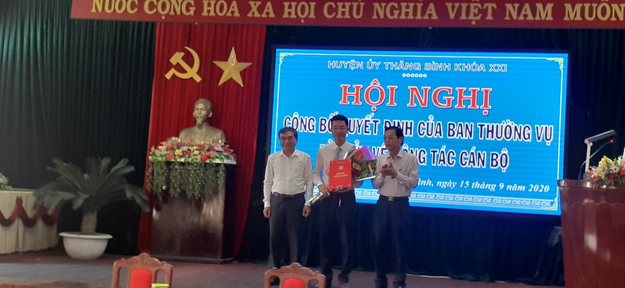 Tại hội nghị, đồng chí Phan Văn Bình - Phó trưởng Ban Tổ chức Tỉnh ủy đã công bố Quyết định số 1864-QĐ/TU ngày 11/9/2020 của Ban Thường vụ Tỉnh uỷ về việc luân chuyển cán bộ lãnh đạo, quản lý; theo đó, luân chuyển đồng chí Nguyễn Đức Bình - Phó Chánh Văn phòng Tỉnh ủy đến nhận công tác tại Huyện ủy Thăng Bình, chỉ định tham gia Ban Chấp hành Đảng bộ huyện, Ban Thường vụ Huyện ủy và giữ chức vụ Phó Bí thư Huyện ủy Thăng Bình, nhiệm kỳ 2020-2025 kể từ ngày 15/9/2020.