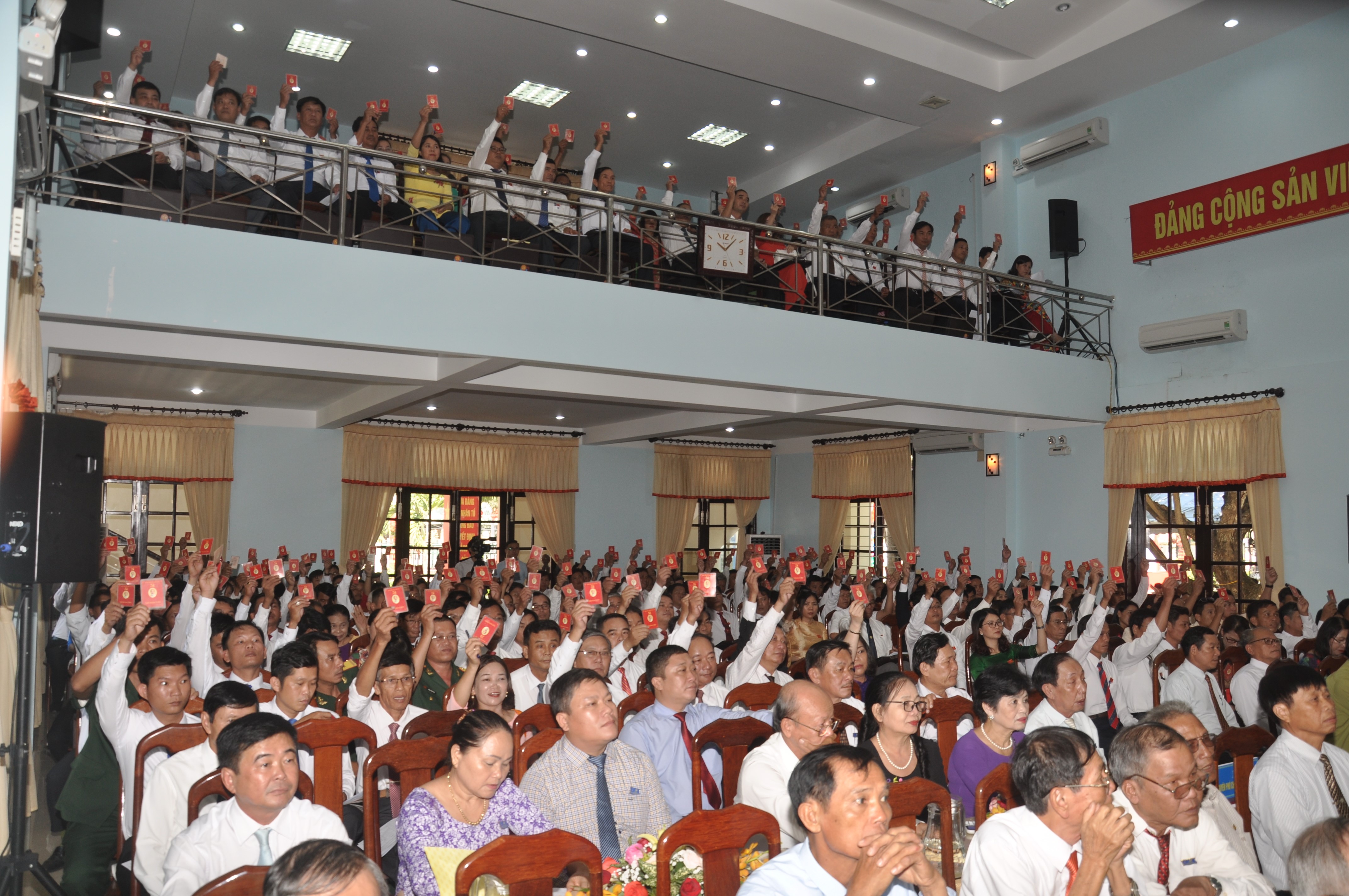(Đại biểu biểu quyết thông qua Nghị quyết Đại hội đại biểu Đảng bộ huyện lần thứ XXI)