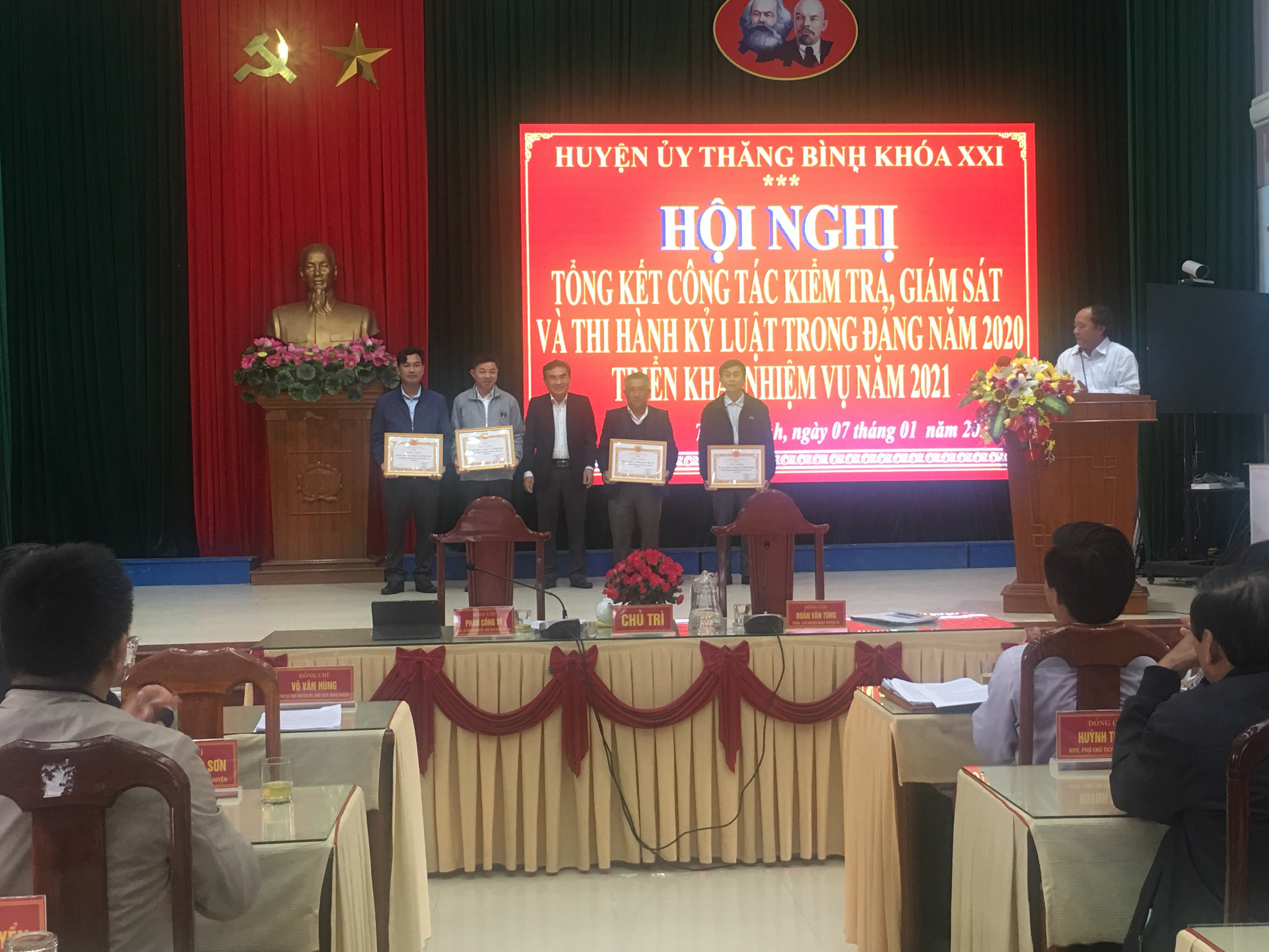 Năm 2020, cấp ủy, tổ chức đảng các cấp trong toàn Đảng bộ huyện đã kiểm tra 88 tổ chức đảng và 85 đảng viên; giám sát chuyên đề giám sát 84 tổ chức đảng và 94 đảng viên. UBKT từ huyện đến cơ sở đã kiểm tra 09 tổ chức đảng và 18 đảng viênkhi có dấu hiệu vi phạm; kiểm tra 71 tổ chức đảng cấp dưới thực hiện nhiệm vụ kiểm tra, giám sát và 65 tổ chức đảng về thi hành kỷ luật trong Đảng; kiểm tra 06 tổ chức đảng về quản lý, sử dụng ngân sách đảng và 59 tổ chức đảng trong việc quản lý, sử dụng đảng phí; giải quyết 01 đơn tố cáo đảng viên. Qua kiểm tra, cấp ủy, tổ chức đảng và UBKT từ huyện đến cơ sở đã thi hành kỷ luật 40 đảng viên vi phạm với các hình thức khiển trách 34 trường hợp, cảnh cáo 06 trường hợp. Với những kết quả đạt được, năm 2020, UBKT Huyện ủy Thăng Bình đã được UBND tỉnh Quảng Nam tặng cờ thi đua ngành kiểm tra Đảng - đơn vị dẫn đầu phong trào thi đua ngành kiểm tra Đảng các huyện, thị, thành phố đồng bằng toàn tỉnh.