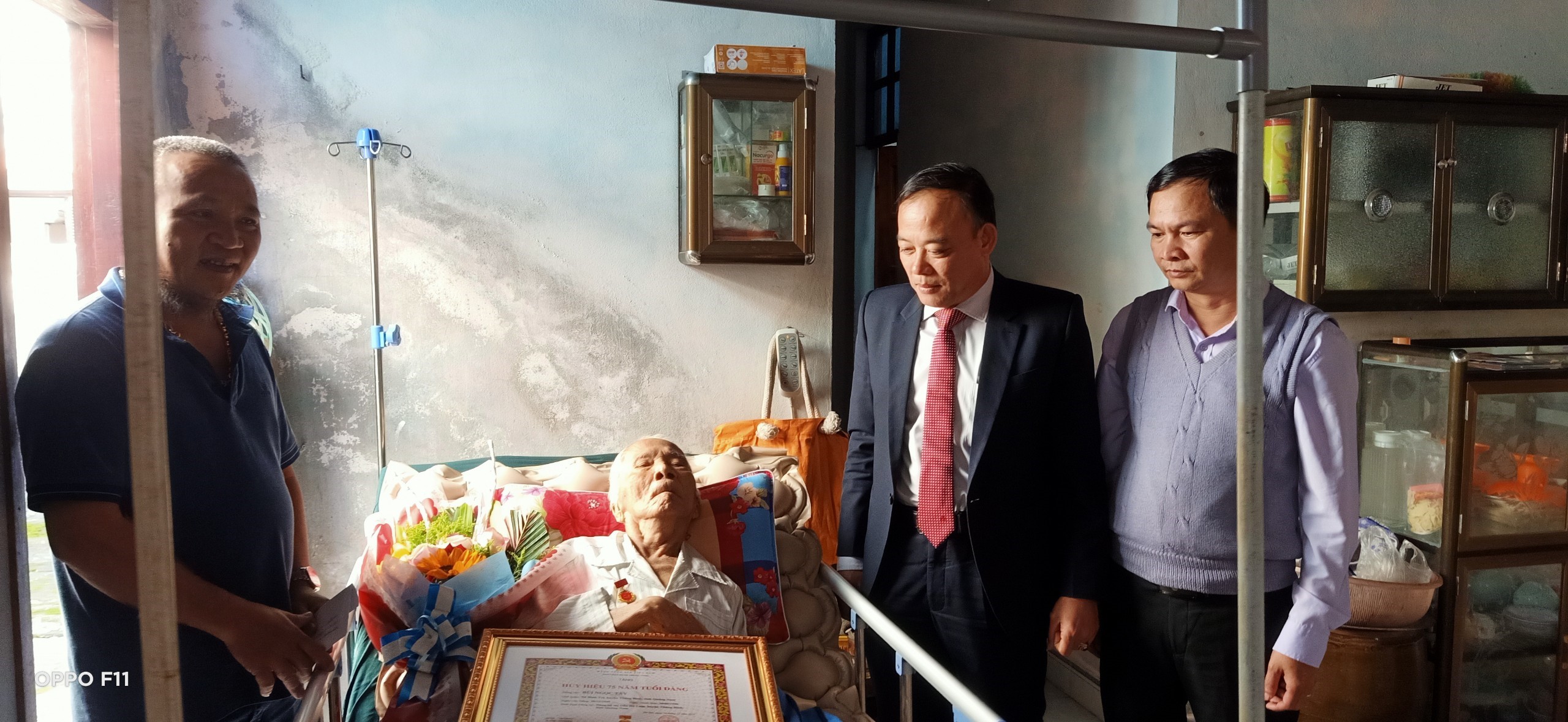 (Ảnh: Đồng chí Lê Quang Hạt - Phó Bí thư Thường trực Huyện ủy trao Huy hiệu 75 năm tuổi Đảng)