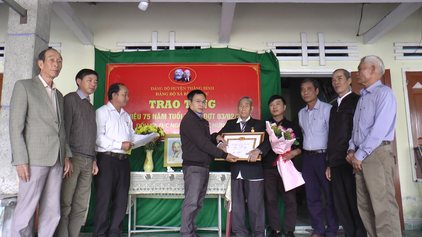 Tại đây, ông Võ Tấn Thuận - Trưởng Ban Tổ chức Huyện ủy đã trao Huy hiệu 75 năm tuổi Đảng cho đảng viên Nguyễn Quốc Hưng ở thôn Tất Viên, xã Bình Phục.