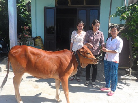 Ảnh: Bà Nguyễn Thị Pho - Chủ tịch Hội LHPN huyện Thăng Bình trao bò cho phụ nữ nghèo