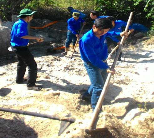 Ảnh: Đoàn viên thanh niên đang tích cực giúp dân xây cầu