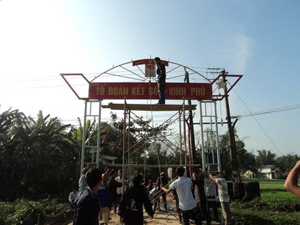 Quang cảnh thanh niên tổ 3 thôn Vinh Phú chuẩn bị một số công đoạn cuối để đưa vào sử dụng cổng chào
